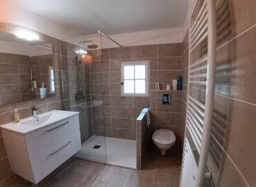 Salle de bain avec douche et toilettes.
