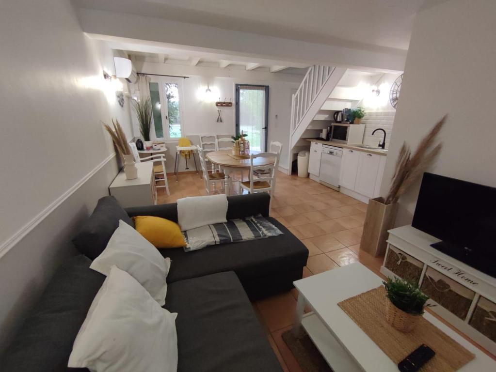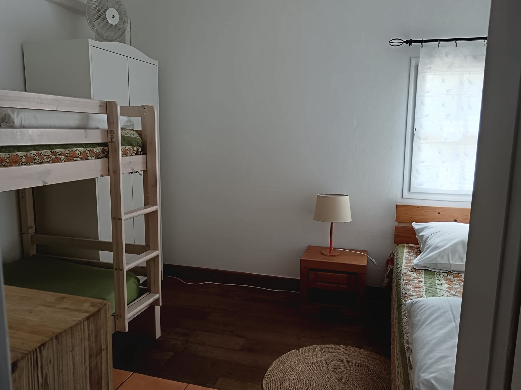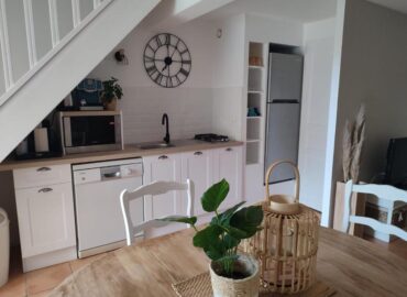 Cuisine bien équipée avec lave-vaisselle, 2 chambres à l’étage, un lit double, et la 2 ème chambre 1 lit superposé, 1 lit simple