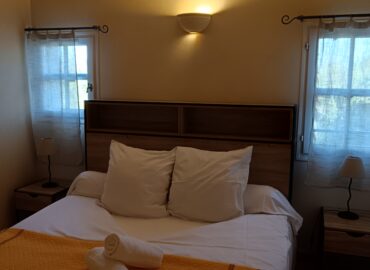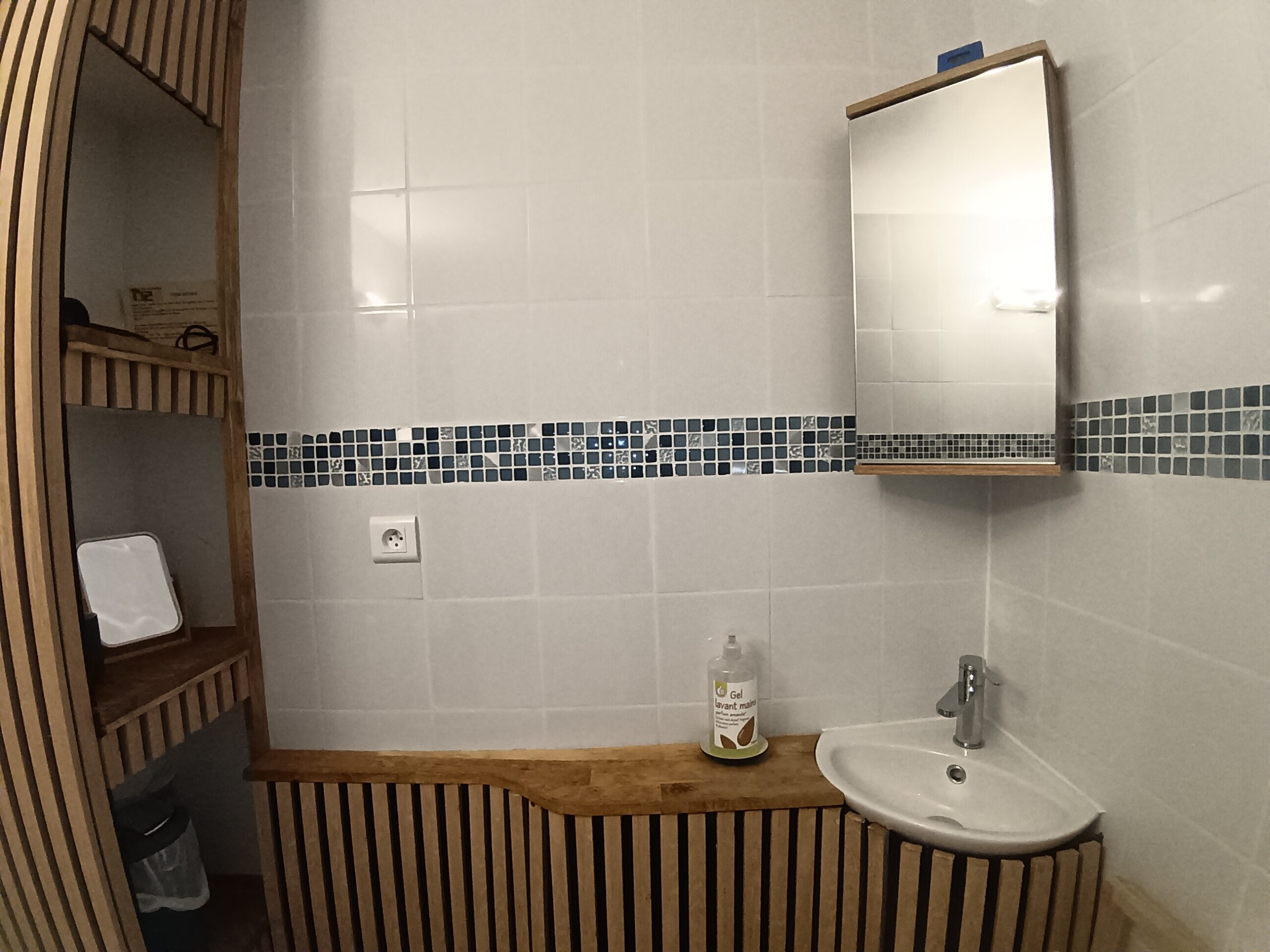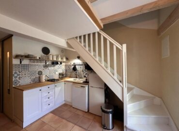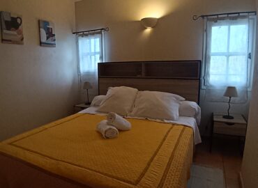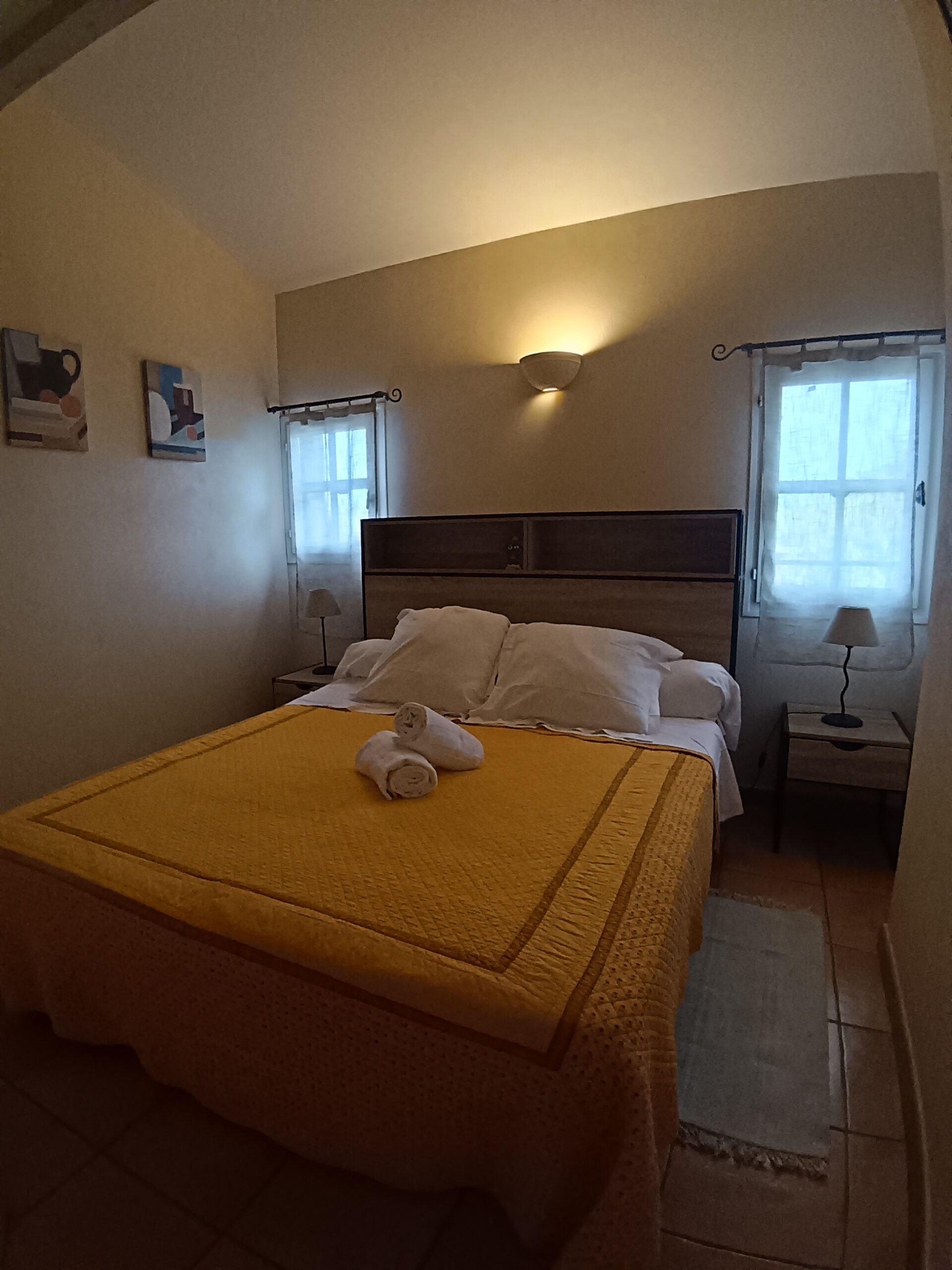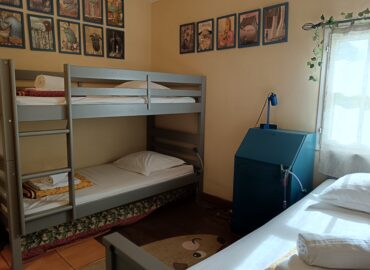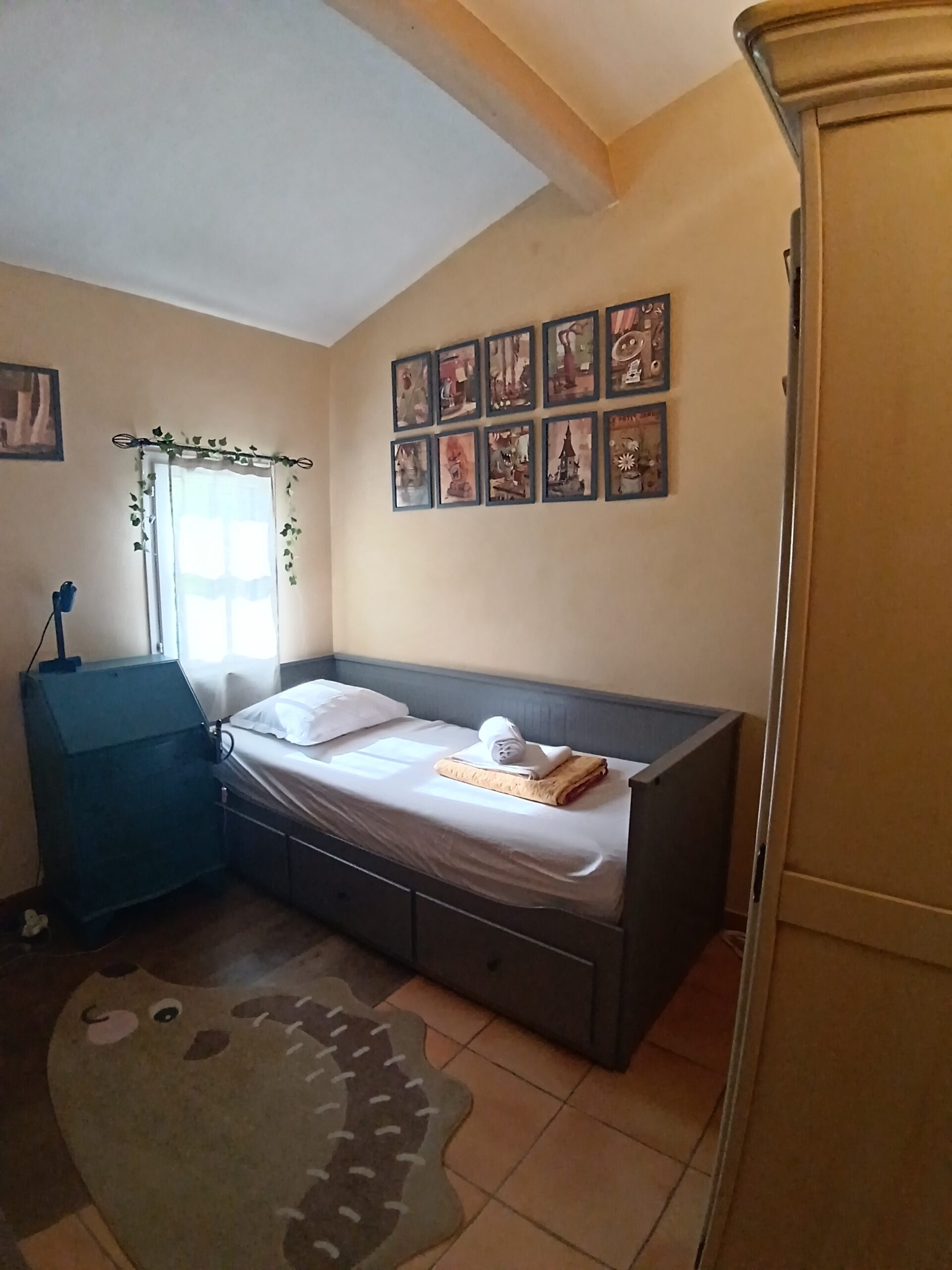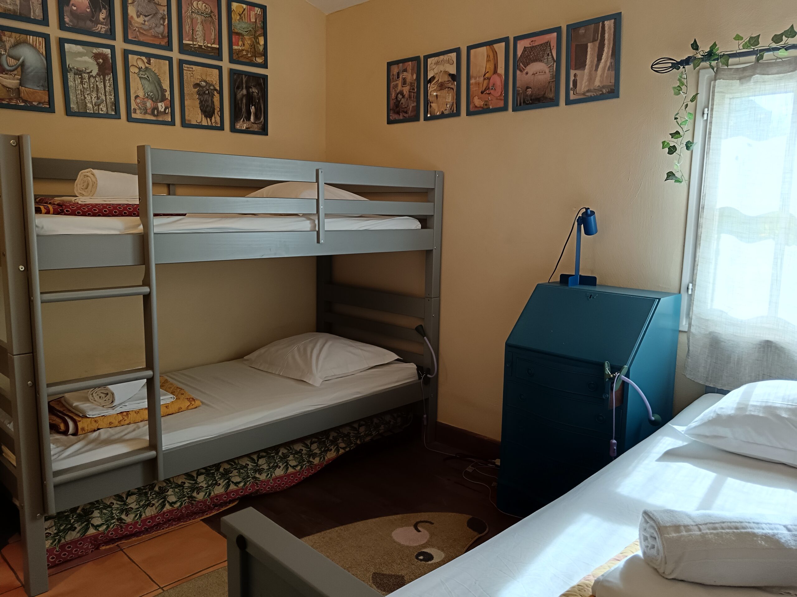 2 chambres à l’étage, un lit double et la 2 ème chambre 1 lit superposé, 1 lit simple, et 1lit d’appoint.